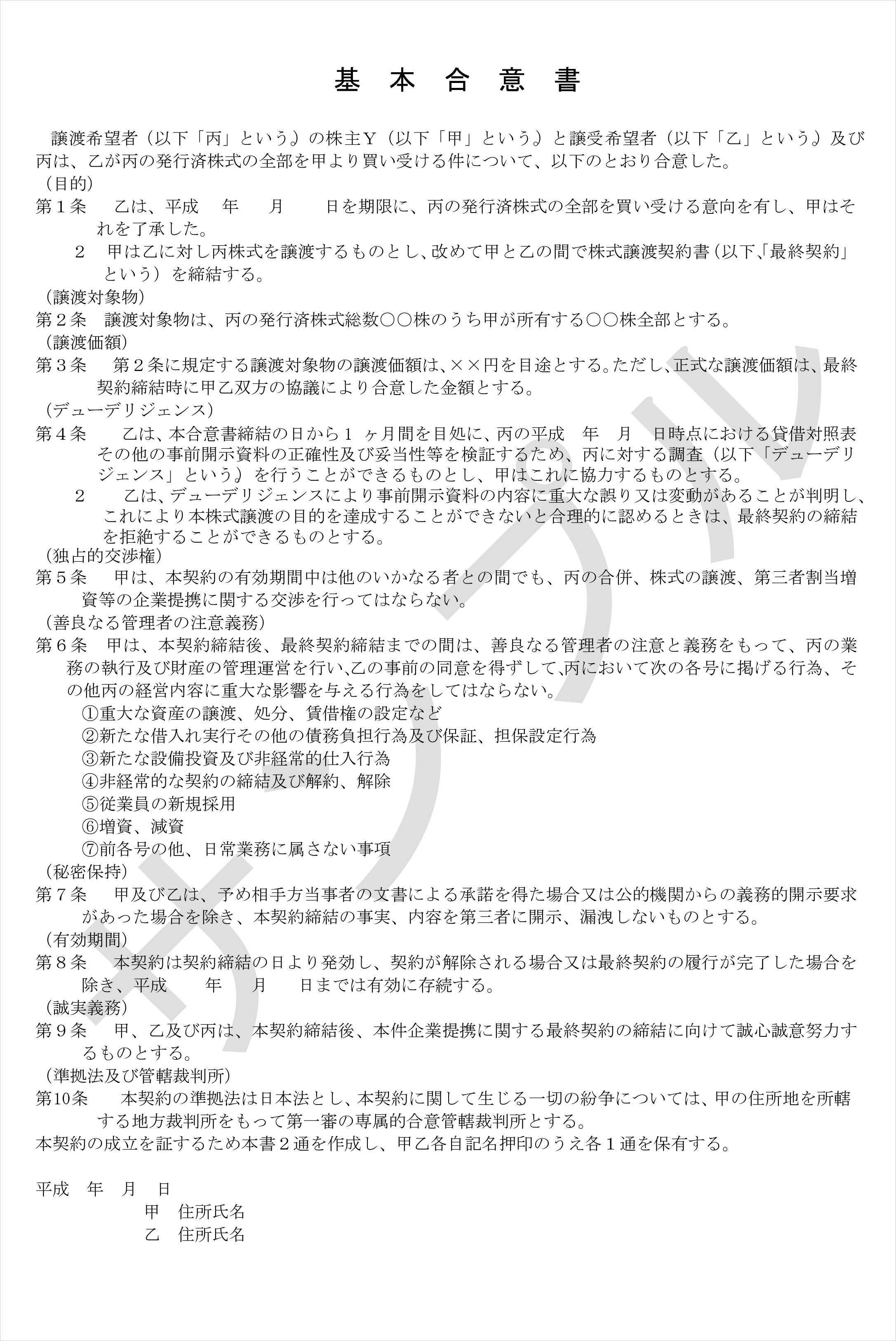 当事者間の交渉により、概ね条件合意に達した場合は、譲り渡し企業と譲り受け企業との間でデューデリジェンス前の対価額や経営者の処遇、役員・従業員の処遇、最終契約締結までのスケジュールと双方の実施事項や遵守事項、条件の最終調整方法等、主要な合意事項を記載した基本合意書を締結します。