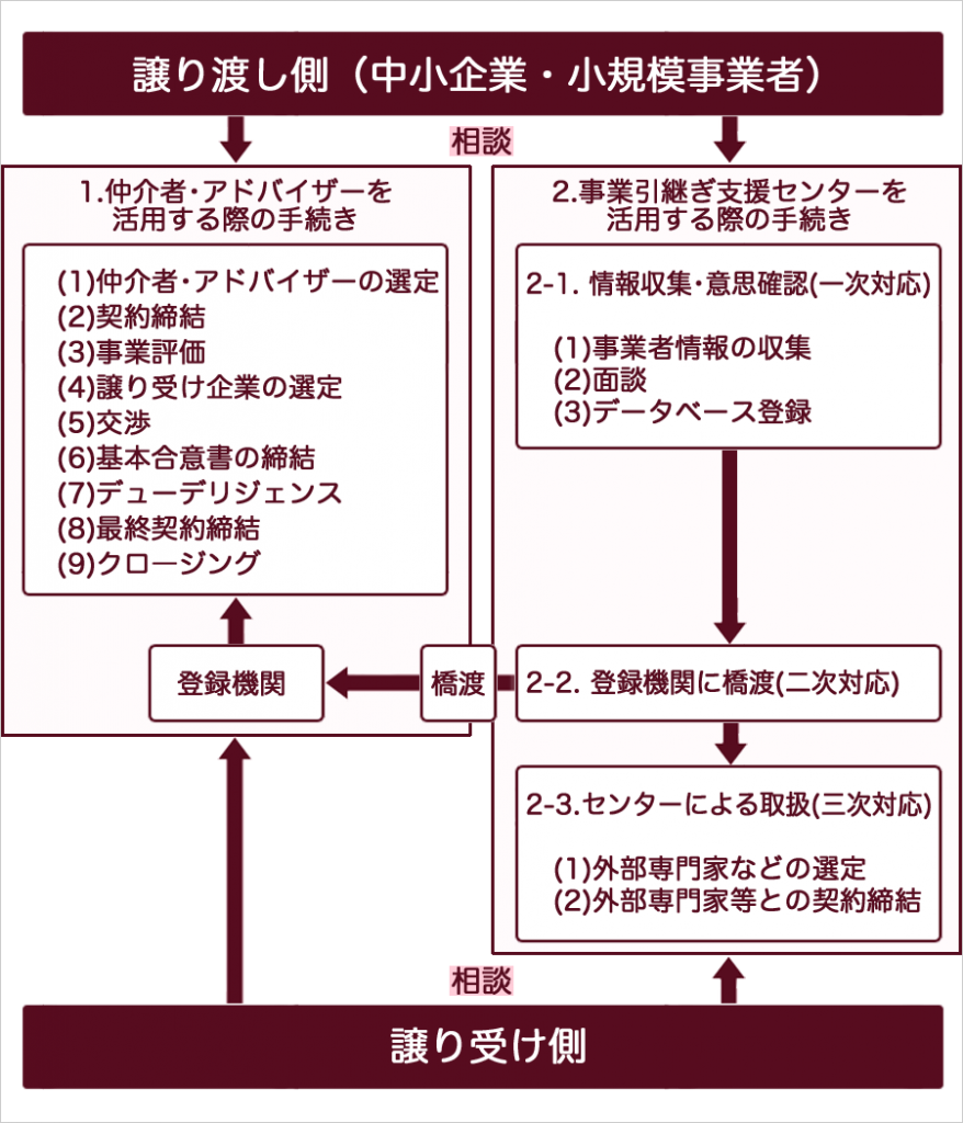 ここでは、後継者不在の中小企業・小規模事業者を会社に引継ぐ場合(いわゆるM&A)の手続きフローをみてみましょう。